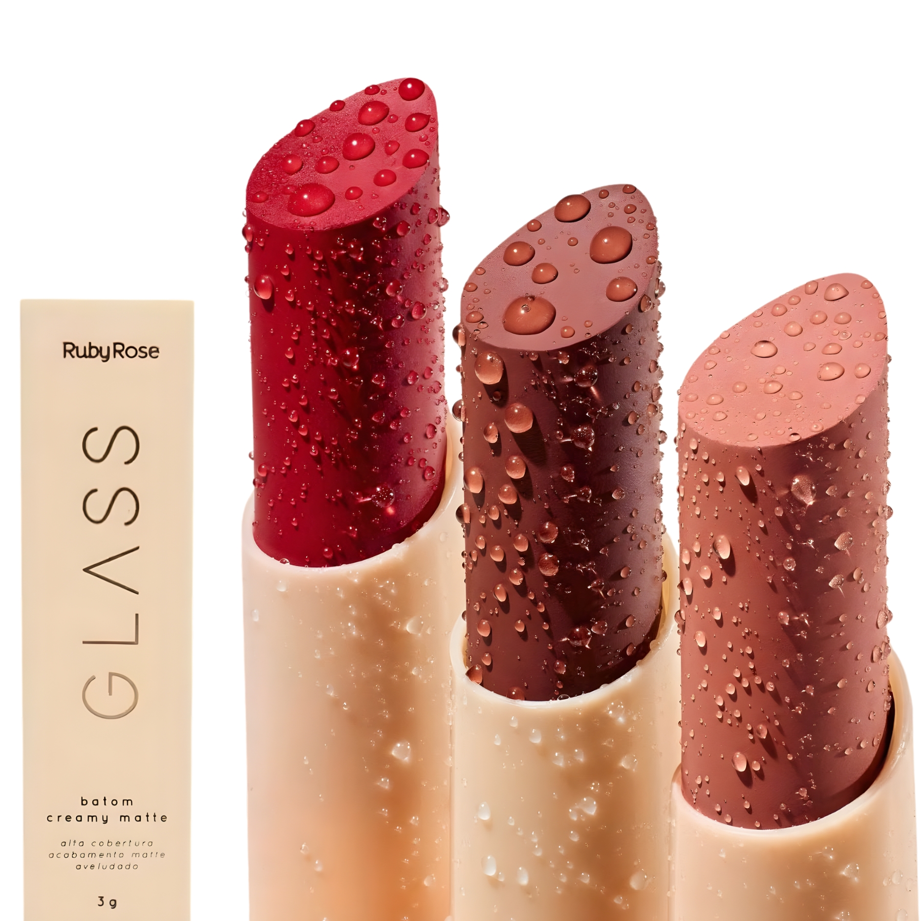 O Batom Ruby Rose Creamy Matte da linha Glass (modelo HBF567) oferece alta cobertura e um acabamento matte aveludado e confortável, que não resseca os lábios. Sua fórmula contém Vitamina E, Manteiga de Karité e Cera de Candelila, sendo resistente à água e com longa duração.
