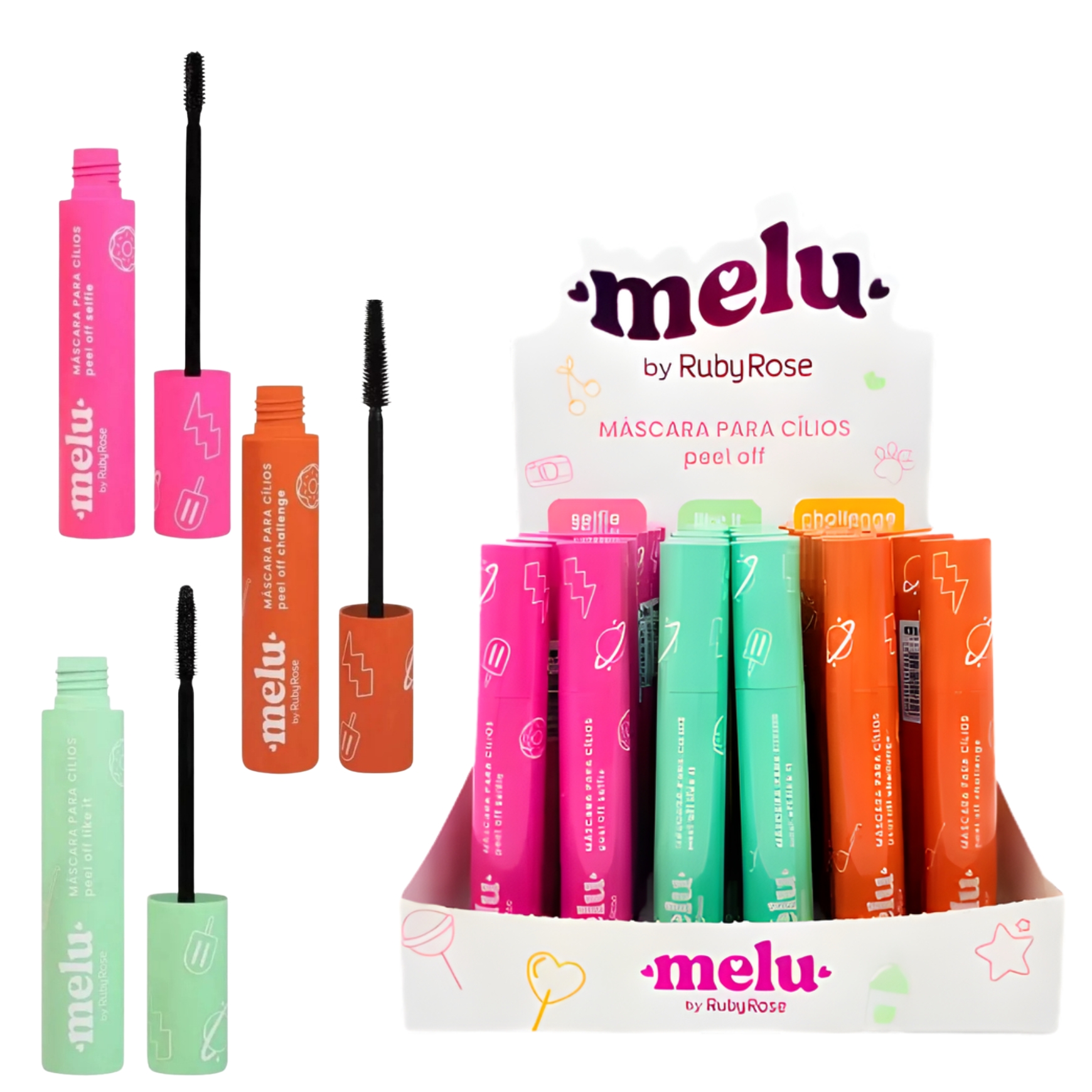 A Máscara para Cílios Peel Off Selfie da linha Melu by Ruby Rose é um rímel com tecnologia peel off (que descama em película), desenvolvido para realçar o olhar com aplicação fácil e remoção prática — ideal para looks marcantes e selfies incríveis!