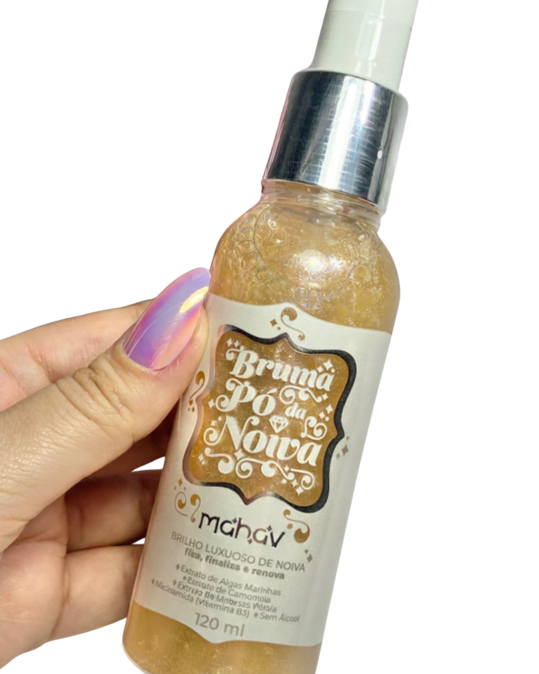 A Bruma Fixadora de Maquiagem Pó da Noiva Mahav é formulada com um mix de pigmentos nobres, oferece pontos de luz finíssimos e delicados, que podem ser aplicados antes, durante e depois da make, no rosto, corpo, cabelos e até na roupa.