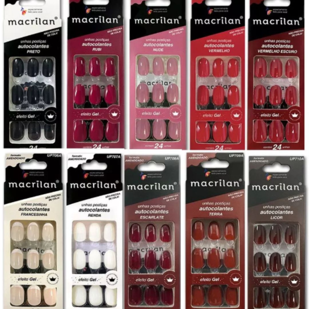 Com um design autocolante, a aplicação é simples e rápida, dispensando o uso de cola adicional e minimizando a bagunça durante a aplicação. As unhas postiças Macrilan são perfeitas para quem deseja uma manicure profissional no conforto de casa, proporcionando um acabamento perfeito e duradouro. Feitas com material de alta qualidade, elas garantem resistência e conforto ao longo do uso.