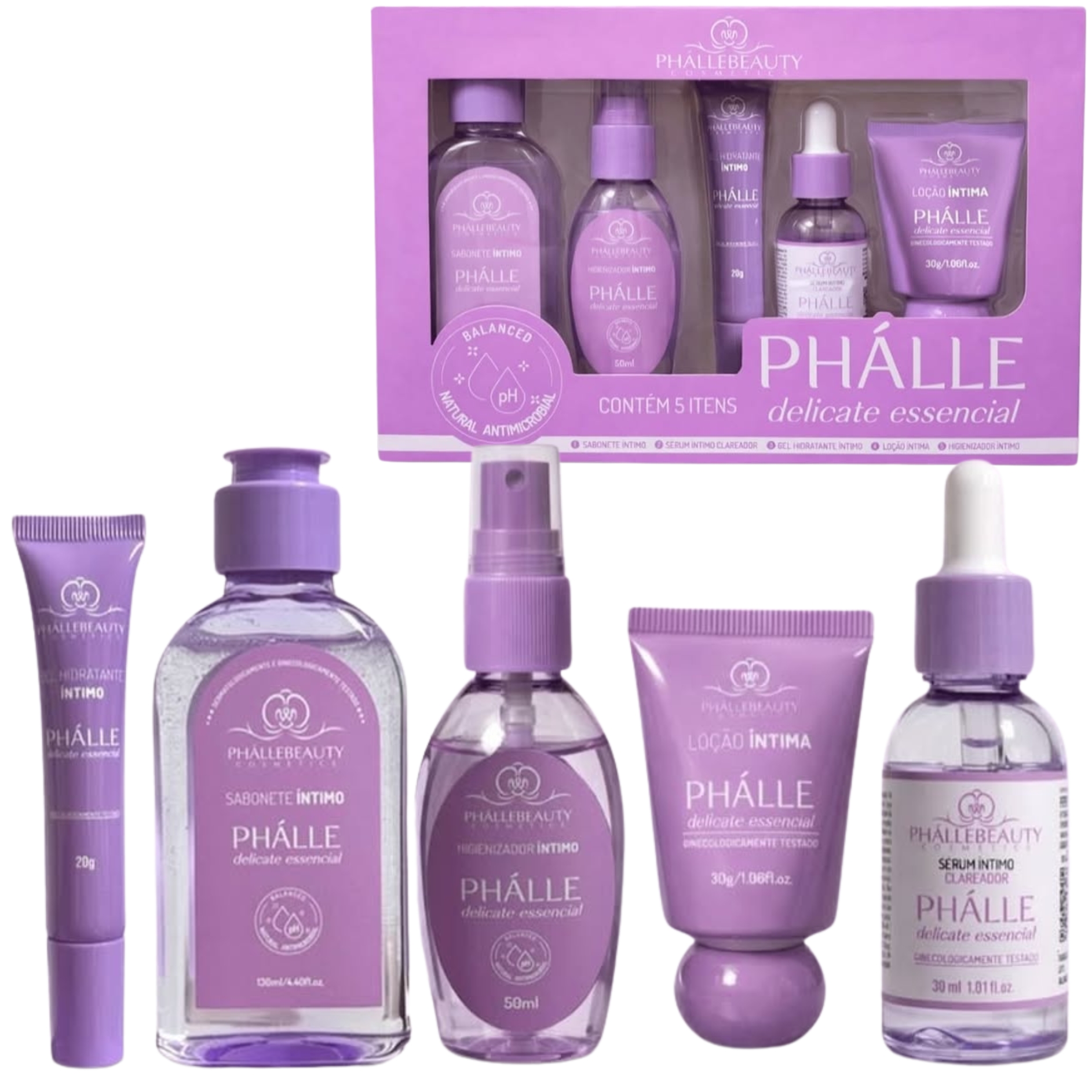 O Kit Íntimo Delicate Essencial PhálleBeauty é uma rotina completa de cinco passos para o cuidado íntimo feminino, que visa limpar suavemente, hidratar, uniformizar o tom da pele e manter o equilíbrio do pH da região.