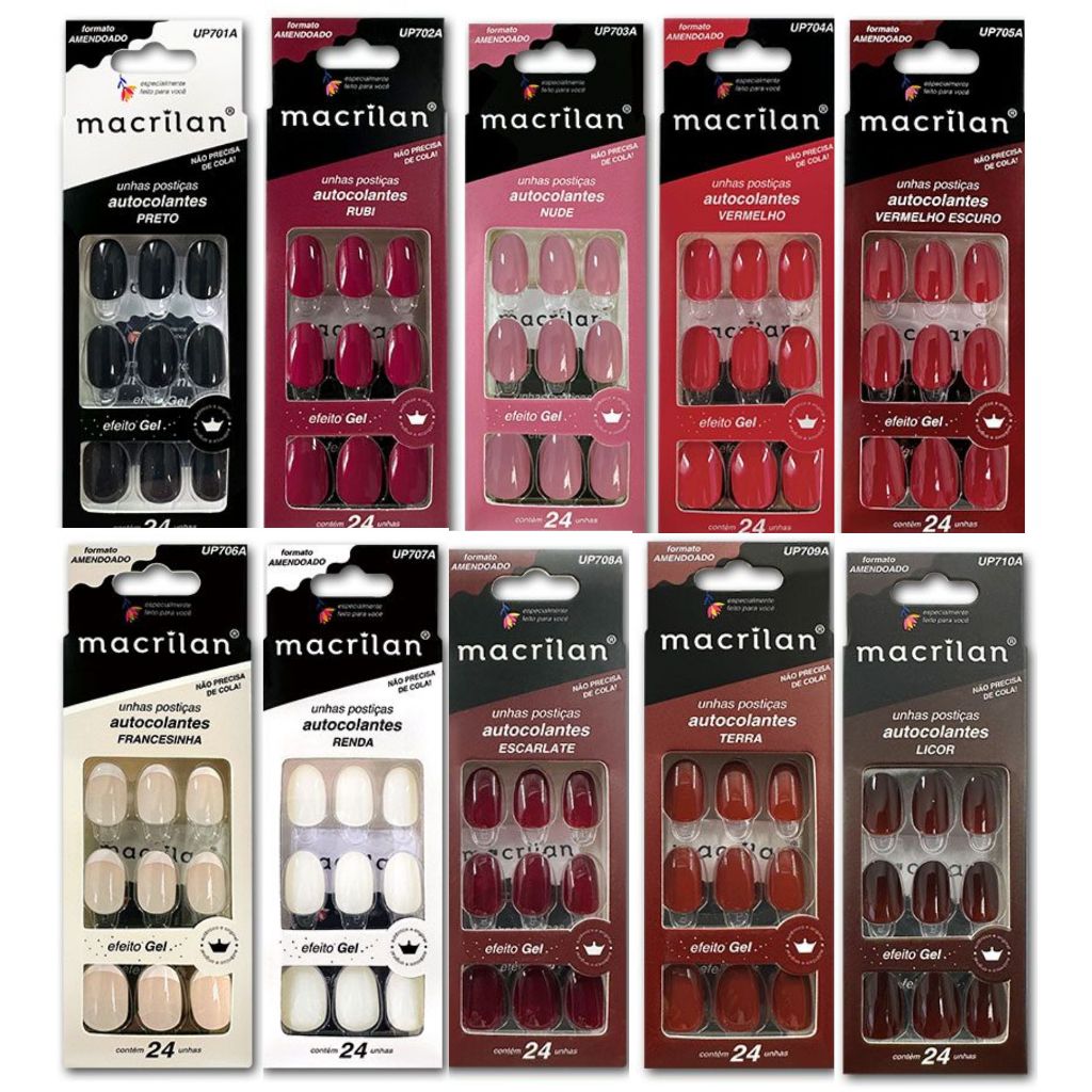 Unhas Postiças Macrilan, especialmente desenvolvidas em uma versão colorida, formato amendoado e com adesivo autocolante para uma aplicação rápida e segura. Indicadas para uso pessoal e profissional. O Kit também tem lenços umedecidos, mini lixa e palito que ajudam a preparar a unha para a aplicação e remoção.